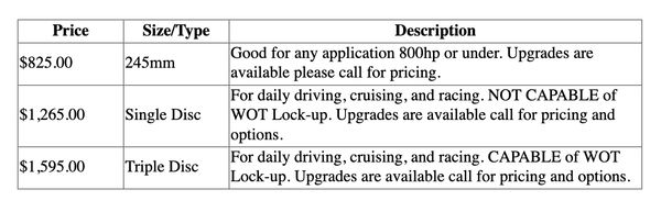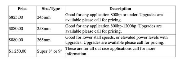 Our converters are built in house, each converter is custom built to your application, using the same parts used by the big name converter companies from companies such as Sonnax, Transmission Specialties, TCS, Precision, and others. We will offer several types of converters to fill your power and budget.