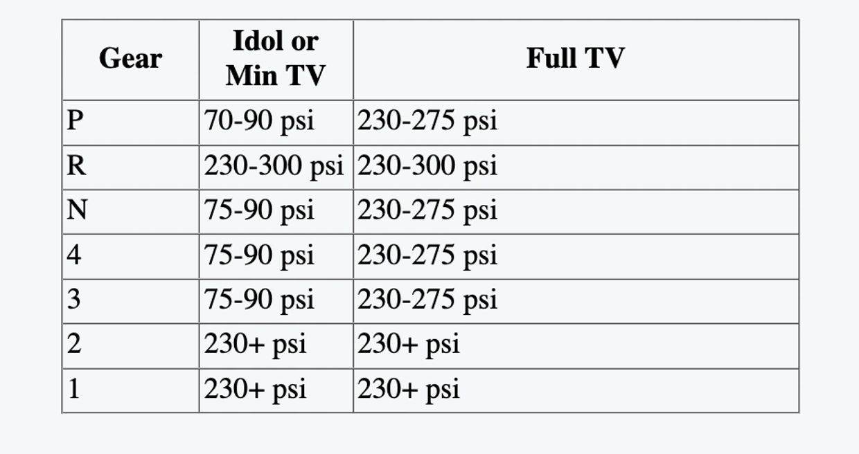 Note: Pressures above 90 psi at idle may result in 2nd gear starts, particularly when the transmission fluid is warm. You may need to back off the cable adjustment slightly until you get down to 90 psi or less idle pressure. As long as you have instant pressure rise on any movement of the TV cable, you will not cause damage to the transmission.
